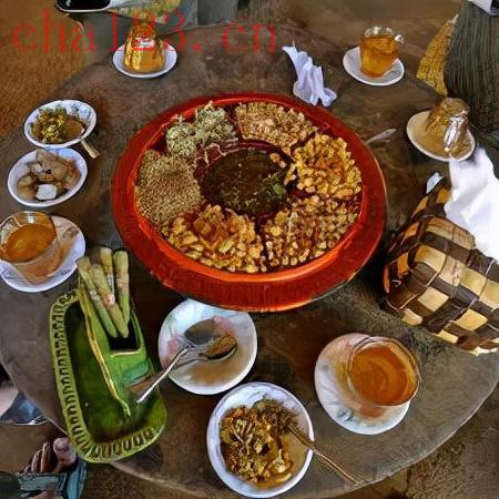 缅甸绝对有一种非常不同和独特的方式或生产称为lephet的调味茶。茶叶先软化,然后冷却并紧紧卷起,让它们老化。 Lephet 是缅甸所有社交场合最受欢迎和必吃的菜肴之一。泡茶放在中间的托盘上,周围是其他配菜,如虾、芝麻、大蒜、花生和干豌豆。