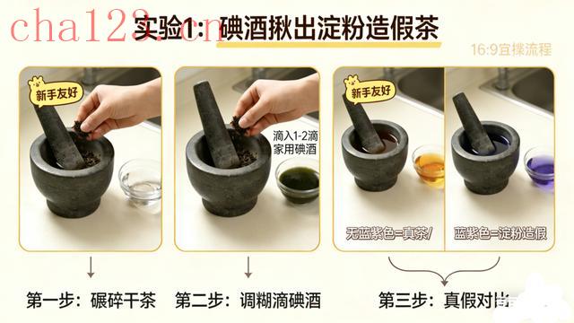 ✅ 实验1:碘酒测淀粉造假(排查掺假茶)原理:真普洱不含淀粉,而部分假茶会掺淀粉增重或仿“醇厚口感”,淀粉遇碘会变蓝紫色。操作:取少量干茶碾碎,加几滴清水调成糊状,滴1-2滴家里的碘酒。如果出现明显蓝紫色,说明是掺了淀粉的假茶;真普洱只会保持碘酒的棕黄色,无变色反应。