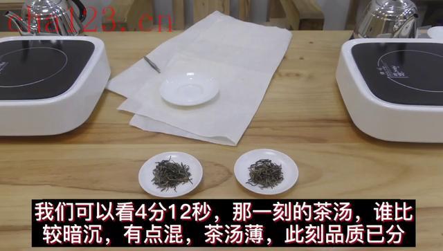 下面我就演示"无接触看芽头分品质"。此技术经陆羽鉴水改良获得,同时该技术补全了陆羽品鉴的真实性。就这是时候表演真正的技术了。大家自己看一下哪个茶汤比较浑就知道是怎么回事了。今天的茶叶看品质,同样的芽头看品质。