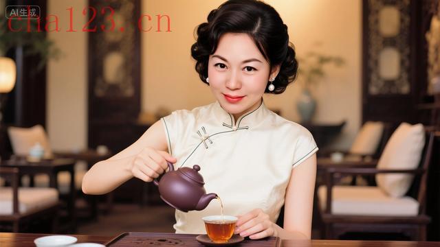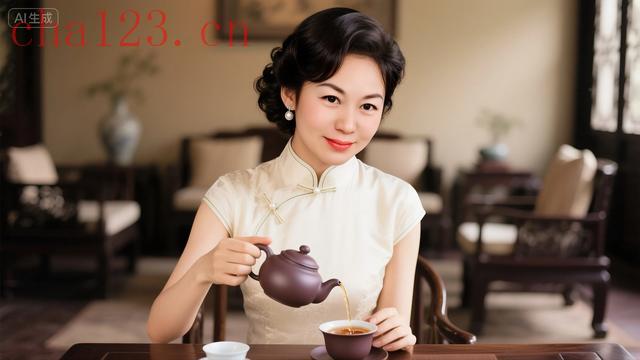 中式茶室场景,一位身着传统白色旗袍的优雅女性,专注冲泡红茶。她手持古朴紫砂茶壶,缓缓向白瓷茶杯注入琥珀色茶汤,背景是中式木质家具、淡雅绿植点缀,营造出静谧、典雅的茶道氛围,体现泡红茶的专业与闲适。