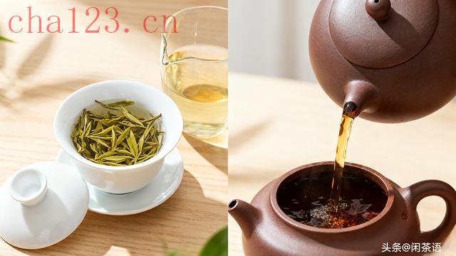 左用瓷盖碗保绿茶之鲜,右用紫砂壶醇普洱之厚,茶具选择是关键