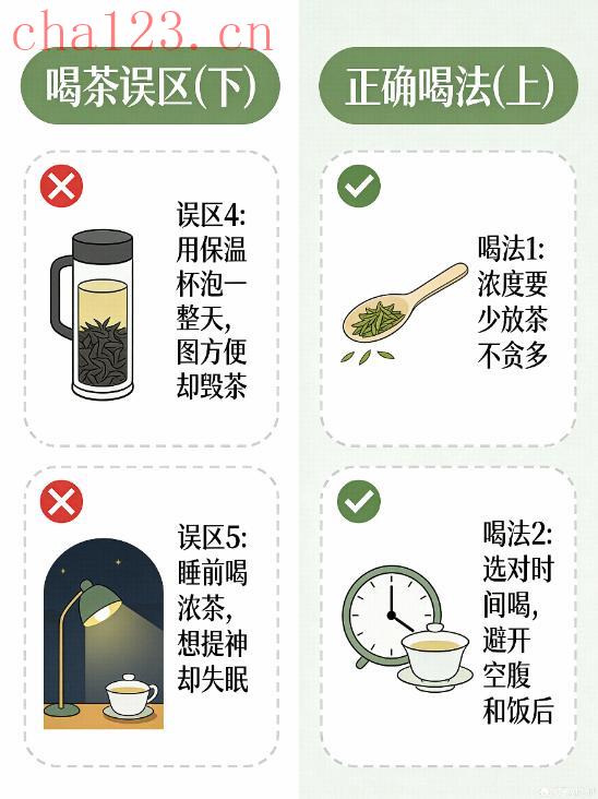 ✅ 喝法2:选对时间喝,避开空腹和饭后喝茶的最佳时间是上午10点到下午4点,这个时间段身体代谢旺盛,能更好地吸收茶叶中的有益成分;早上起床后,建议先吃点面包、馒头等碳水化合物垫一垫,再喝茶;饭后至少要等40分钟到1小时再喝,给肠胃足够的消化时间。