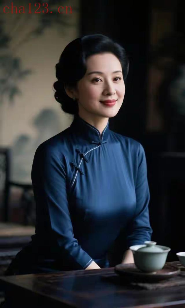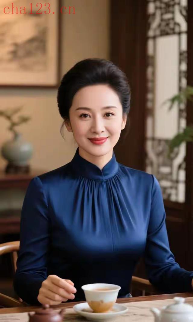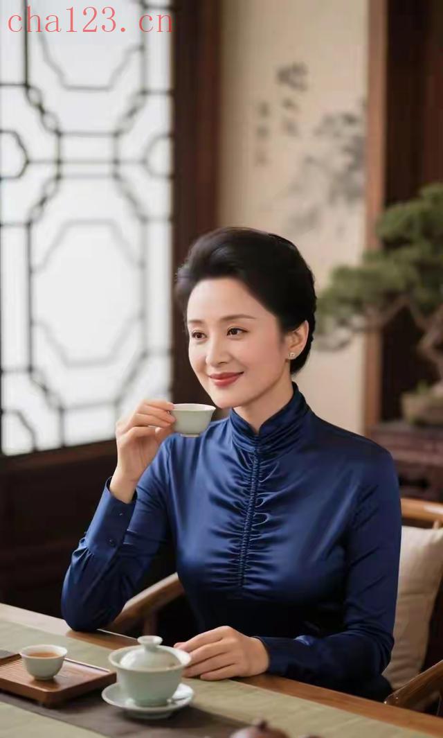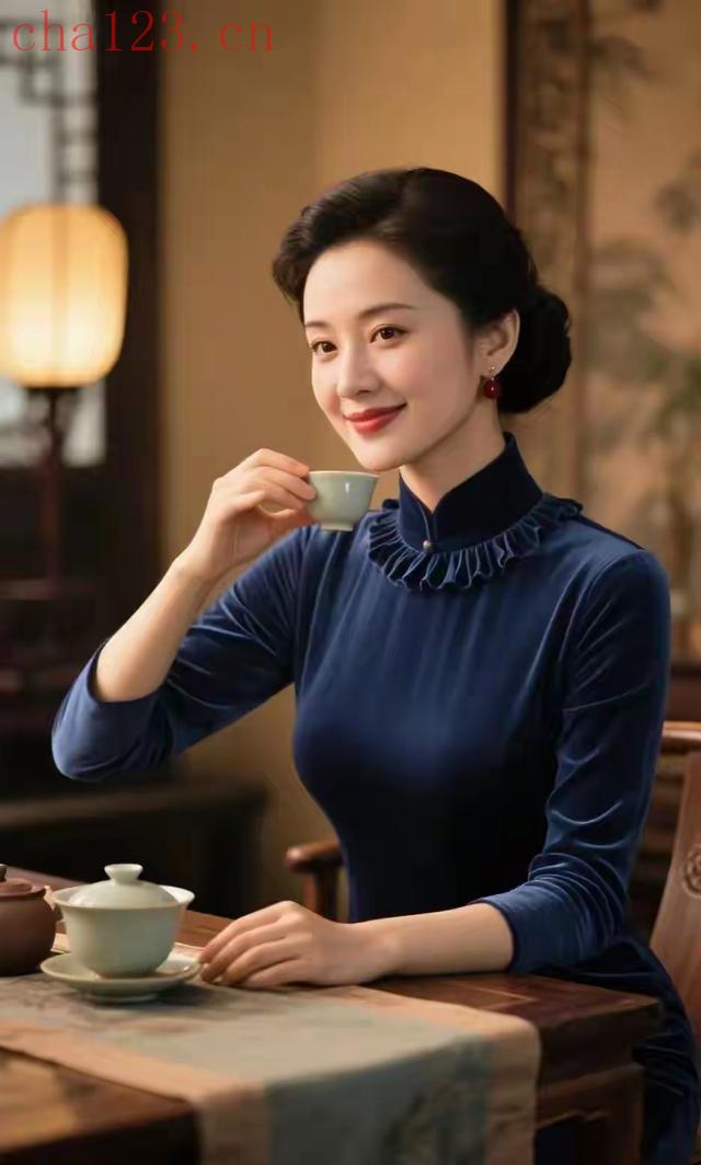 品茶的蓝衣美女