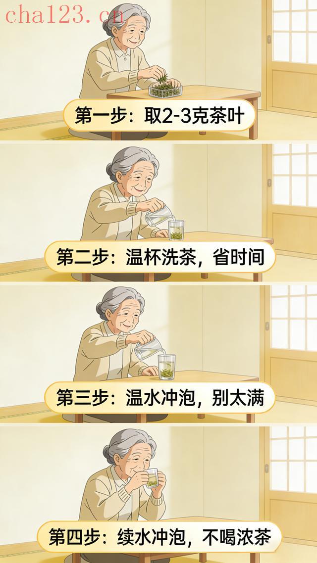 二、4步喝对淡茶,无工具不费力,温和护胃不踩坑这款中老年淡茶饮用技巧,全程就4步,不用专业工具,不用改喝茶习惯,就用家里的杯子、茶叶和开水,5分钟就能搞定,每天花1分钟,不管是早上、下午还是傍晚,都能随手泡一杯,既简单又省心,还能避免伤胃,喝对更养生。