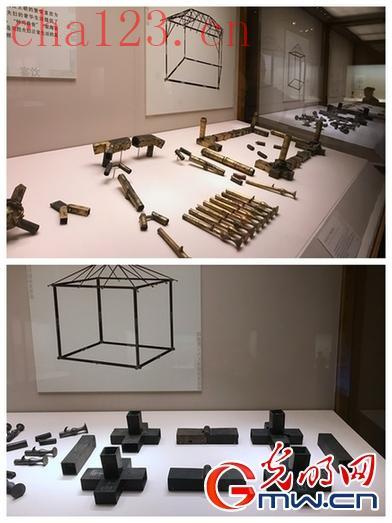 幄帐铜帐构——这种幄帐上有铜质鎏金的大小构件102件,零件上有一、二、三等记号,可组装成14类构件。幄帐内不设立柱,顶盖采用桁架结构,这是建筑史上一大进步。铜构件在工艺上采用凹槽叠压扣合、承插、折叠以及销孔固定等形式,既便于拆装又不失牢固。