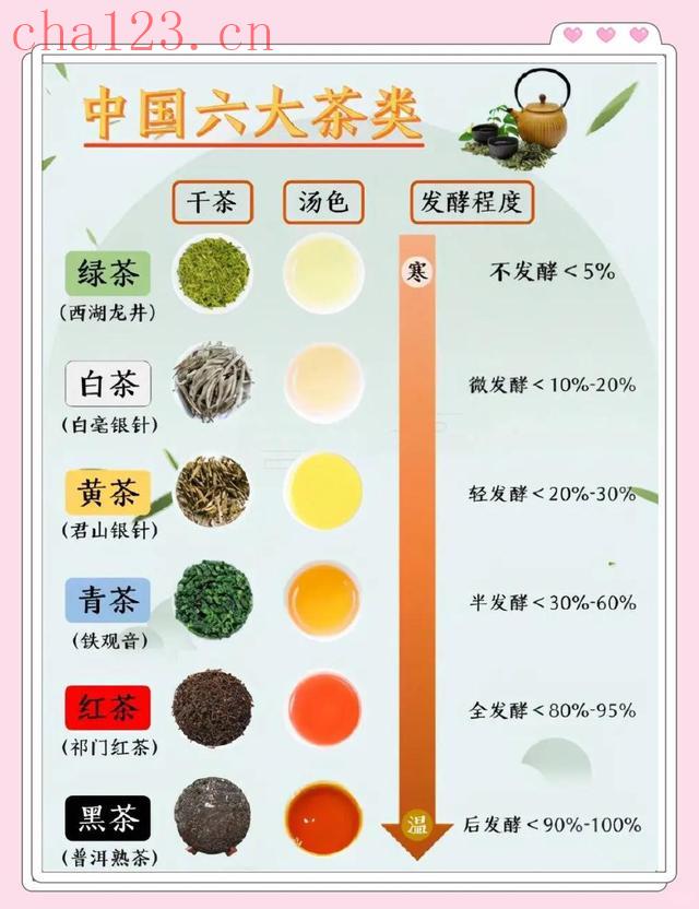 红茶:全发酵,鲜叶彻底氧化变红,茶多酚转化为甜润的物质,比如正山小种、金骏眉,喝起来温润醇厚。