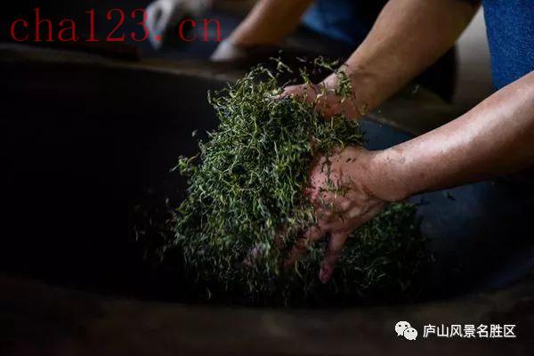 高海拔的庐山云雾茶差不多要到四月中下旬才出芽,其手工制作过程大致分为头次杀青、揉青、二次杀青、搓条、提毫、烘青等几道工序。一锅新鲜茶叶变为成品干茶,整个制作过程耗时约50分钟左右。