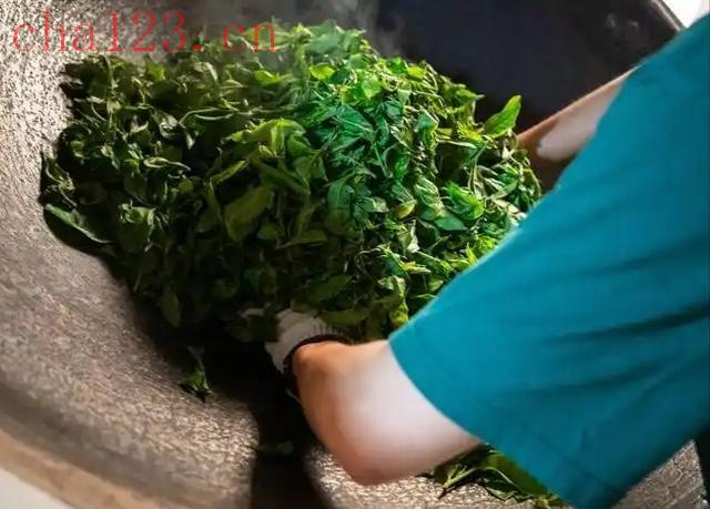 第二次刹青,灶柴火比第一次小一半。将刹过青摊凉后的茶叶倒入锅里,用双手快速进行翻炒,约十分钟左右取出到入大方桌子上,将茶叶进行揉搓,二次挤出涩水,然后进行摊凉,这就是手工制作新茶的第二次:刹青。