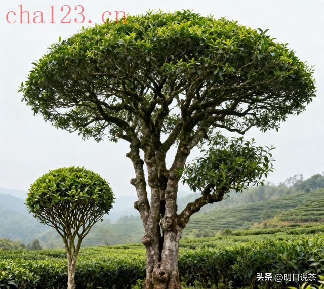 但你别以为“高个子”(乔木)就一定长“大叶子”,现在早不兴这说法了。树型更像个“中介”,它反映的是茶树生长的环境——比如高山上的茶树,大多长得高而疏(乔木),因为山上光照足、空间大,不用挤着长;平地上的茶树,常被修剪得矮矮的(灌木),方便茶农采摘。