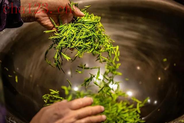 高温除水叶柔软。绿茶杀青,采取高温措施,散发叶内水分,钝化酶的活性,并使鲜叶中的内含物发生一定的化学变化,从而形成绿茶的品质特征。一般是掌握“高温杀青,闷抛结合,少闷多抛,老叶嫩杀,嫩叶老杀”的原则。杀青后叶子叶色暗绿,手捏叶质柔软,略有粘性,梗折不断,手捏成团,略有弹性,青气消失,茶香溢出。