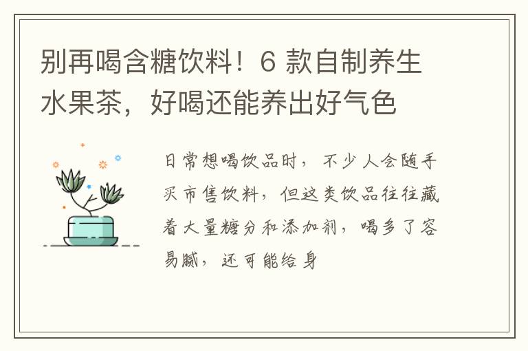日常想喝饮品时,不少人会随手买市售饮料,但这类饮品往往藏着大量糖分和添加剂,喝多了容易腻,还可能给身体带来负担。其实,在家自制养生水果茶是更优选择 —— 新鲜水果搭配温润茶叶,不用复杂技巧,厨房小白也能轻松搞定,喝起来清爽又安心,长期适量饮用,还能悄悄给气色 “加分”。