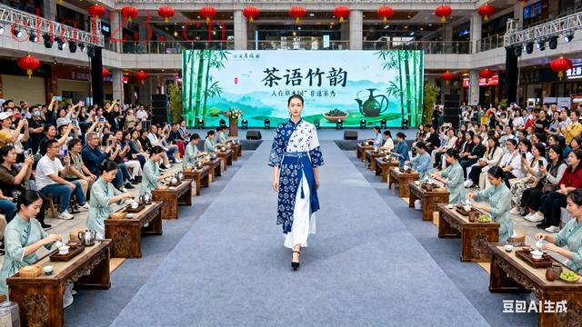 在茶都广场,一场名为“人在草木间”的非遗茶秀精彩上演。这场茶秀分为四个篇章:“茶语竹韵”、“茶音蓝印”、“茶承遗韵”和“茶映海丝”。