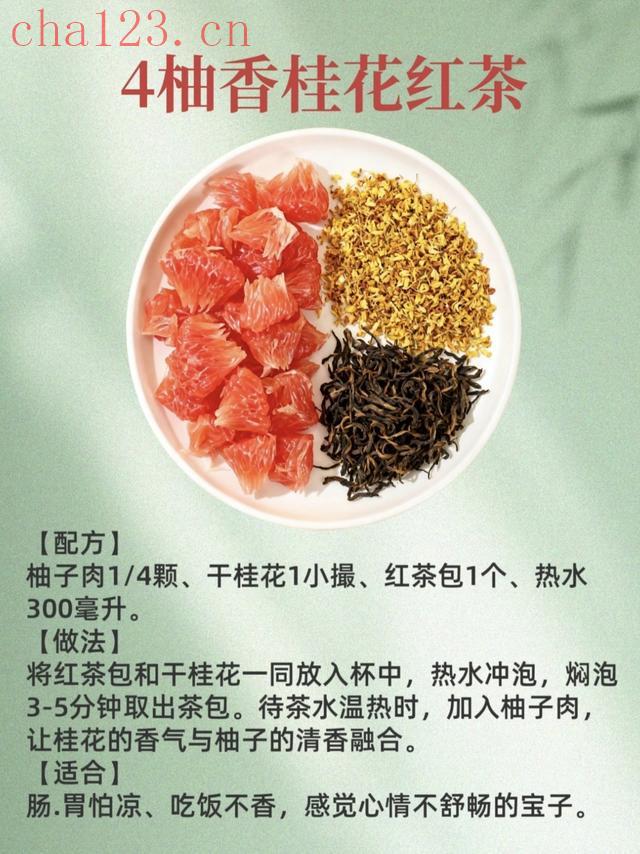 做法:红茶煮开,加入柚子果肉和干桂花,焖3分钟即可。
