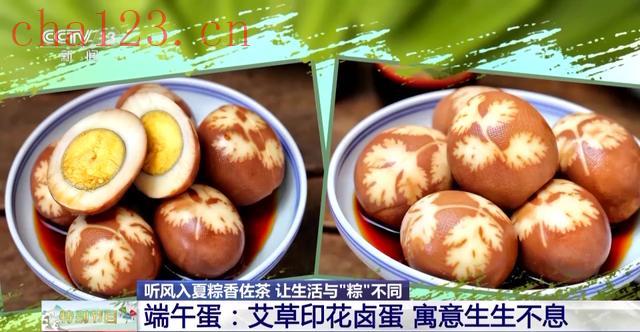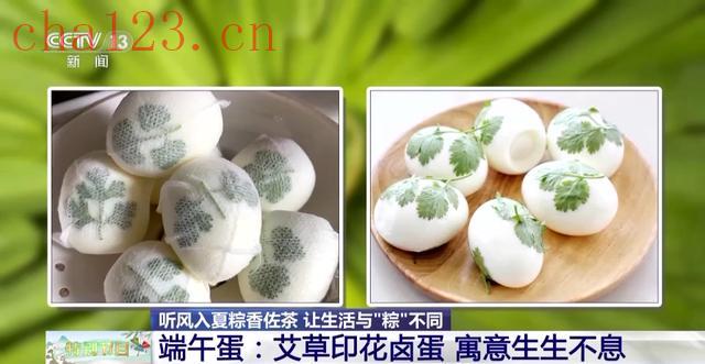 现在有才的美食博主们,还在煮鸡蛋前把一片好看的艾叶贴上去,漂亮又好吃的印花端午蛋就做好了。端午节吃鸡蛋,也代表着人们生生不息的美好愿望。