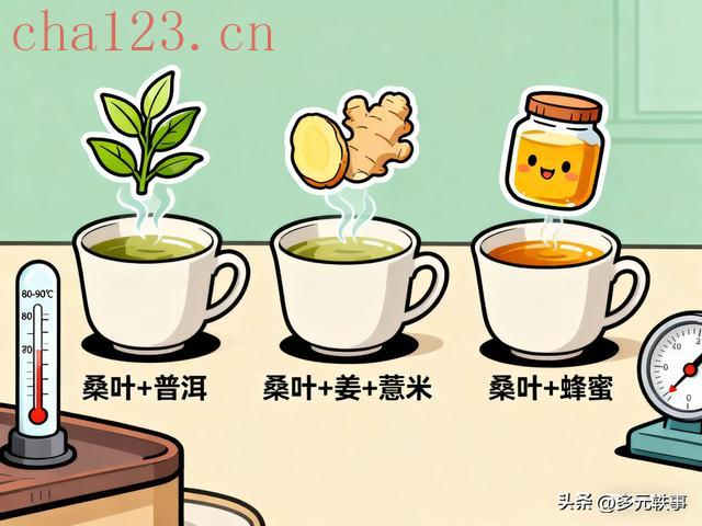 泡的时候也有小技巧,光喝桑叶茶有点微苦,我现在都爱搭配着喝。比如用10克普洱配5克桑叶,热水一冲,普洱的陈香能把桑叶的草青味盖住,喝着特别顺;要是你体寒,泡的时候加几片生姜,再放把提前炒过的薏米,暖乎乎的喝着舒服。水温也得注意,别用刚烧开的沸水,80到90℃的热水最合适,闷3分钟,茶汤金黄透亮,加点蜂蜜,又甜又润燥,秋冬喝着太惬意了。