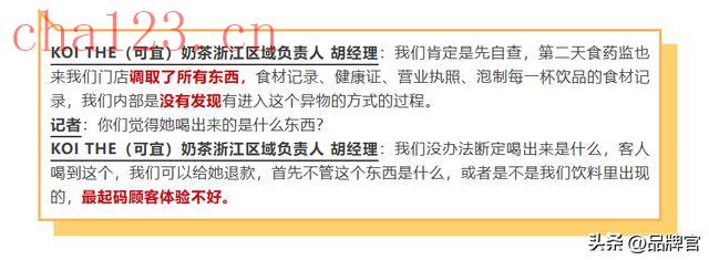 10月9日,涉事门店的工作人员回应称,异物的颗粒那么大,做奶茶不可能发现不了,而且食品药品监督管理部门也已经上门检查,没有发现任何问题。