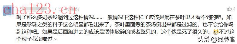 社交平台上,网友们对此事也是议论纷纷,就有网友分析道,这个虫子应该是混在茶叶里所以没发现,毕竟若是后续制作茶饮的时候跑进去的话,应该是活体破碎的或者整只的,这个明显就是已经死了很久了。
