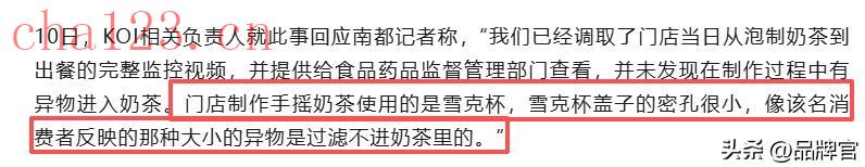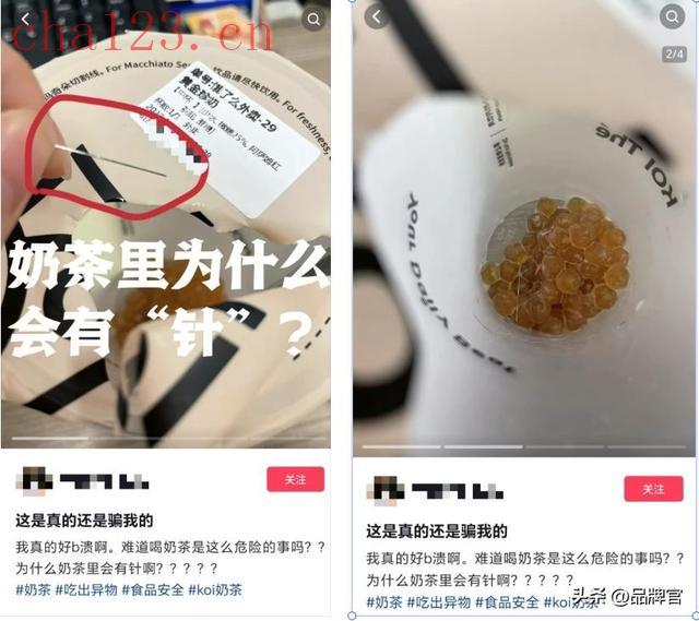 而这并非孤例,2023年,KOI的苏州门店也出现了“奶茶藏针”事件,消费者开盖准备吃珍珠时发现了一根针,而涉事门店称奶茶的细针是砂糖物料厂商出现失误造成的。