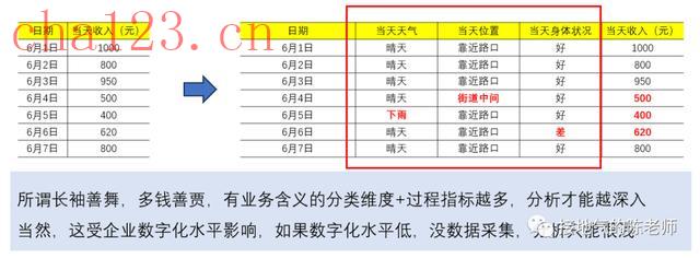 看起来,如果不记录这些原因,是没法深入分析的。于是你如下图所示,对每一天老王的内部因素和外部因素做了记录。这个动作叫:增加分析维度(俗称:打标签)。