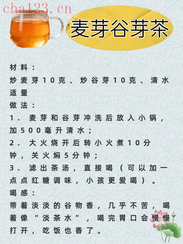 麦芽消米面食积,谷芽开胃健脾,味道清淡,适合小孩吃多了不消化,或老人脾胃功能弱、没胃口时喝,温和又安全。