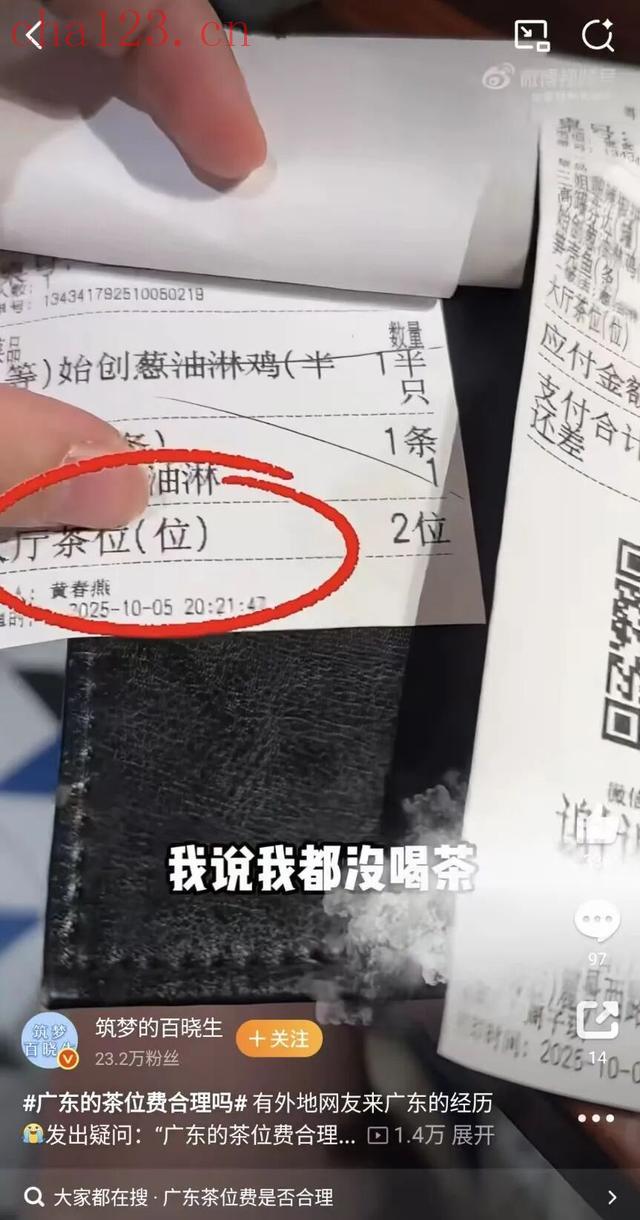继 “8 个月婴儿没喝茶被收茶位费 ” 登上微博热搜榜之后,茶位费话题在社交平台持续引发讨论。一名今年国庆长假期间来广州旅游的游客在视频中如此提问:“广州的家人们,你们觉得收茶位费这个事真的合理吗?”随后, “ 广东的茶位费合理吗 ” 在 10 月中旬成为热搜话题 。