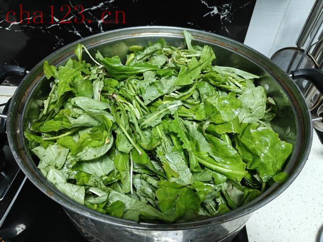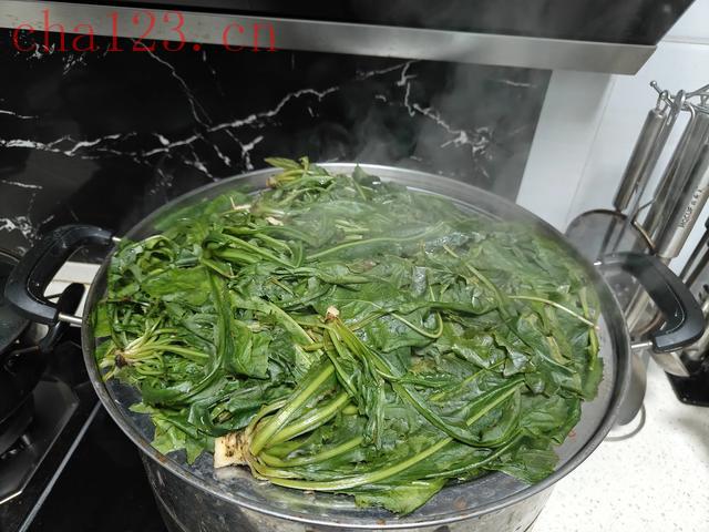 我先将摘净的新鲜蒲公英用清水洗干净后放到篦子上控水,然后放进蒸馍锅里待蒸汽上来后蒸上三分钟进行杀青,再取出放凉,为节省时间我等它们放凉后直接上手诺去它们的水份,由于蒲公英棵较大,我又将它们放到案板上切上几刀,最后经直放入铁锅中开炒。