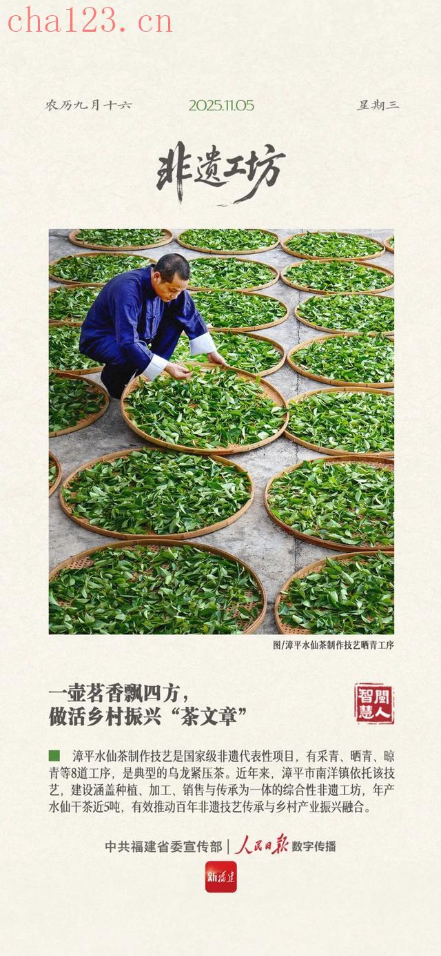 漳平水仙茶制作技艺是国家级非遗代表性项目,有采青、晒青、晾青等8道工序,是典型的乌龙紧压茶。近年来,漳平市南洋镇依托该技艺,建设涵盖种植、加工、销售与传承为一体的综合性非遗工坊,年产水仙干茶近5吨,有效推动百年非遗技艺传承与乡村产业振兴融合。