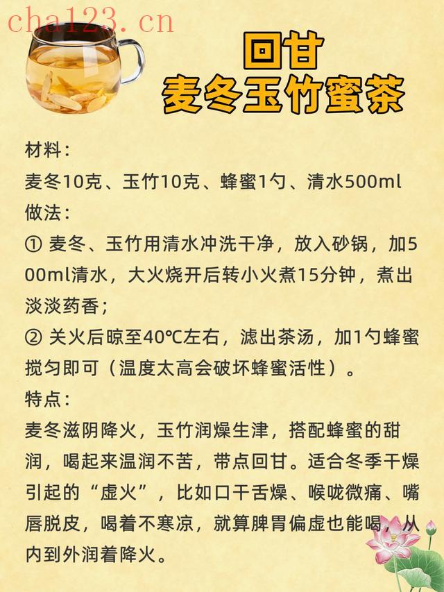 麦冬滋阴降火,玉竹润燥生津,搭配蜂蜜的甜润,喝起来温润不苦,带点回甘。适合冬季干燥引起的“虚火”,比如口干舌燥、喉咙微痛、嘴唇脱皮,喝着不寒凉,就算脾胃偏虚也能喝,从内到外润着降火。