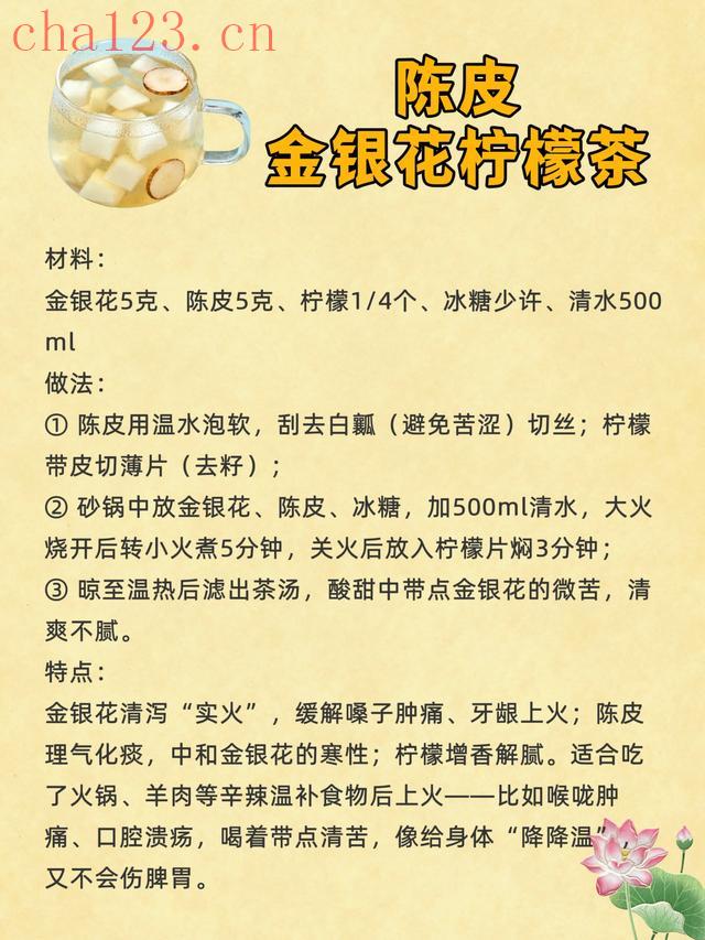 金银花清泻“实火”,缓解嗓子肿痛、牙龈上火;陈皮理气化痰,中和金银花的寒性;柠檬增香解腻。适合吃了火锅、羊肉等辛辣温补食物后上火,喝着带点清苦,像给身体“降降温”,又不会伤脾胃。