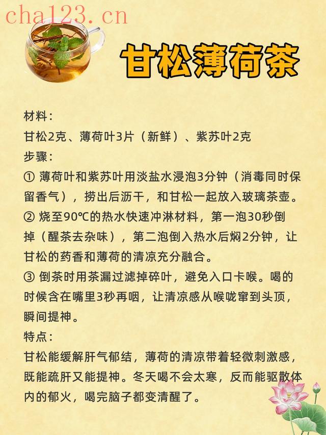 甘松能缓解肝气郁结,薄荷的清凉带着轻微刺激感,既能疏肝又能提神。冬天喝不会太寒,反而能驱散体内的郁火,喝完脑子都变清醒了。