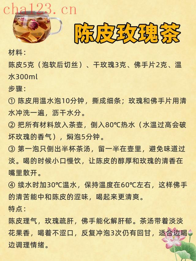 陈皮5克(泡软后切丝)、干玫瑰3克、佛手片2克、温水300ml