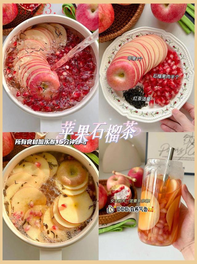 - 食材:苹果1个、石榴果肉半个(剥好)、红茶5克