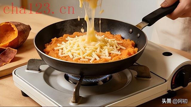 组装焗烤(无烤箱版也能做)烤箱版:把调好的红薯泥填回红薯外皮里,表面均匀铺满芝士碎,放入预热好的烤箱,180℃烤 8 分钟,直到芝士融化并出现焦黄色斑点。平底锅版:红薯泥装入碗中,表面铺芝士碎,平底锅小火加热,盖上锅盖焖 5 分钟,直到芝士完全融化,中途可以开盖观察状态,避免糊底。装饰出锅烤好的芝士焗红薯取出,撒上一层熟黑芝麻点缀,浓郁的香味瞬间扑面而来。用勺子挖一勺,芝士能拉出长长的丝,搭配绵密的红薯泥,口感层次直接拉满!
