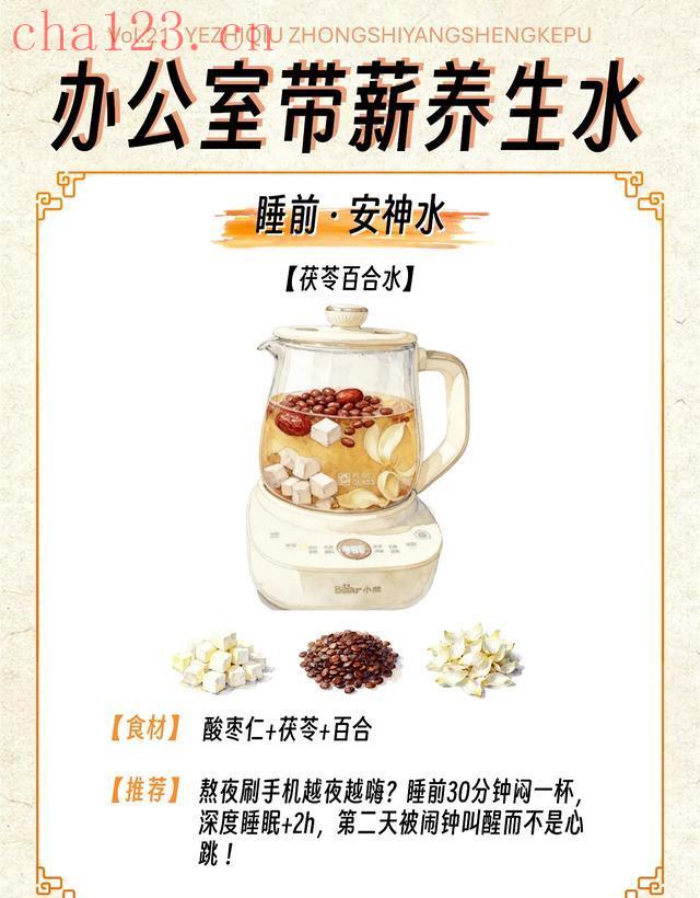 怎么做:酸枣仁8g、茯苓10g、干百合5g,先冷水泡10分钟,再小火煮15分钟,睡前半小时喝。
