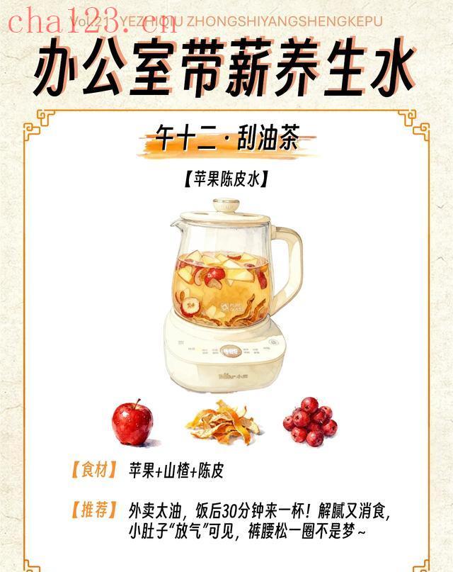 怎么做:苹果小块(去核)、干山楂3颗(去核)、陈皮3g,加500ml清水小火煮15分钟,饭后半小时喝。