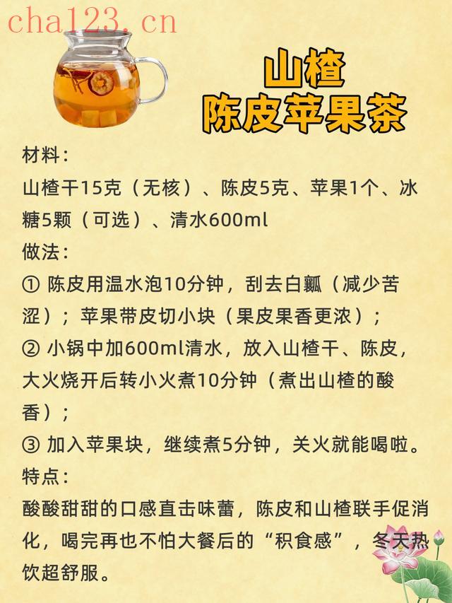 山楂干15克(无核)、陈皮5克、苹果1个、冰糖5颗(可选)、清水600ml