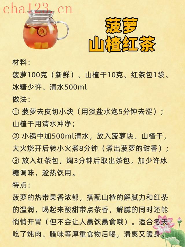 菠萝的热带果香浓郁,搭配山楂的解腻力和红茶的温润,喝起来酸甜带点茶香,解腻的同时还能悄悄开胃(但不会让人暴饮暴食哦)。适合冬天吃了炖肉、腊味等厚重食物后喝,清爽又暖身。