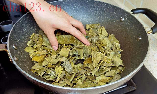 4.取一个无水无油的炒锅,将锅烧热后,调为最小火,将柿子叶放入锅中,用手慢慢地烘炒,大概炒3-5分钟左右,将柿子叶炒至卷起,将柿子叶内的水分完全炒干后,关火,盛出放凉后,装入密封的容器内保存即可。