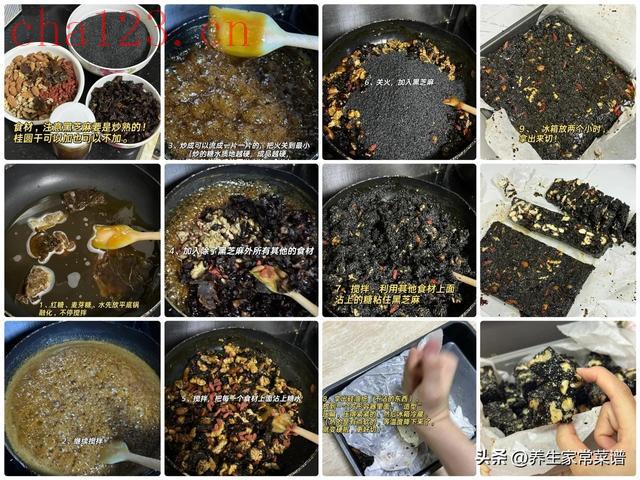 食材处理小技巧:黑芝麻和核桃提前用小火炒香,磨成细粉更易入口,熬制糕体时用小火慢熬,定型后切小块,吃着更方便。