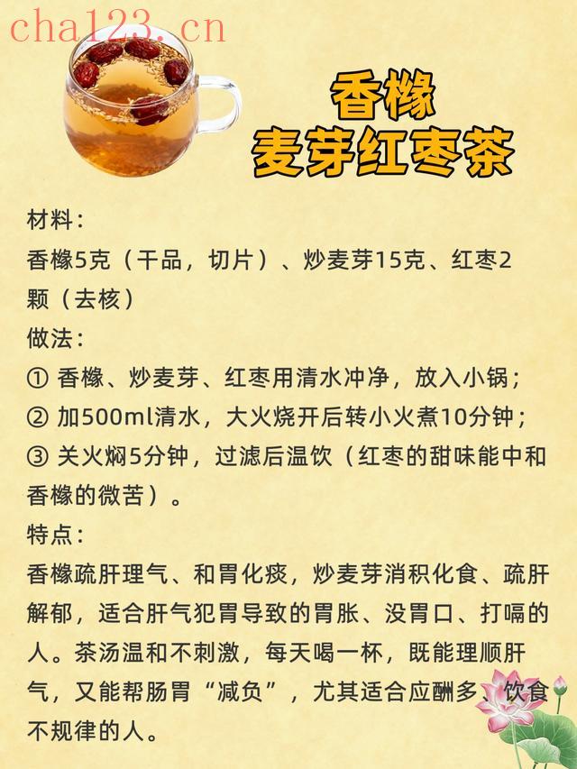 香橼疏肝理气、和胃化痰,炒麦芽消积化食、疏肝解郁,适合肝气犯胃导致的胃胀、没胃口、打嗝的人。茶汤温和不刺激,每天喝一杯,既能理顺肝气,又能帮肠胃“减负”,尤其适合应酬多、饮食不规律的人。