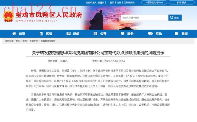 记者查询得知,全国多地市场监管部门曾发布以黑茶为媒介进行传销的风险提示。2025年12月15日、16日,宝鸡市政府官网、宝鸡市凤翔区人民政府官网先后发布《关于防范“理想华莱科技集团有限公司宝鸡代办点”涉嫌非法集资的风险提示》《关于转发防范“理想华莱科技集团有限公司宝鸡代办点”涉嫌非法集资的风险提示》。其中提到两名女性持有理想华莱科技集团有限公司营业执照和直销经营许可证复印件,推销茶叶获取高额提成,经金台区打非办组织区公安分局、区市场监督管理局、陈仓镇等相关部门人员上门排查,初步认定该代办点涉嫌非法集资或非法传销。