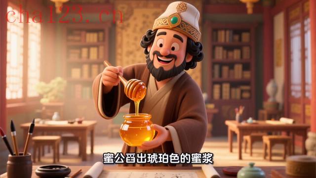 最逗的是校经老吏,那日喉燥声哑,诵经时把南无阿弥陀佛念成了南咳阿弥。小沙弥们捂嘴笑老吏爷,您这是要给佛祖递咳痰帖。正乱时西域来的养蜂人蜜公赶着驼队进了经坊,他卸下三只陶瓮,瓮口蜡封一揭,满院顿生异香。蜜公舀出琥珀色的蜜浆,笑吟吟道各位笔墨菩萨,试试咱这润燥解毒百花膏。