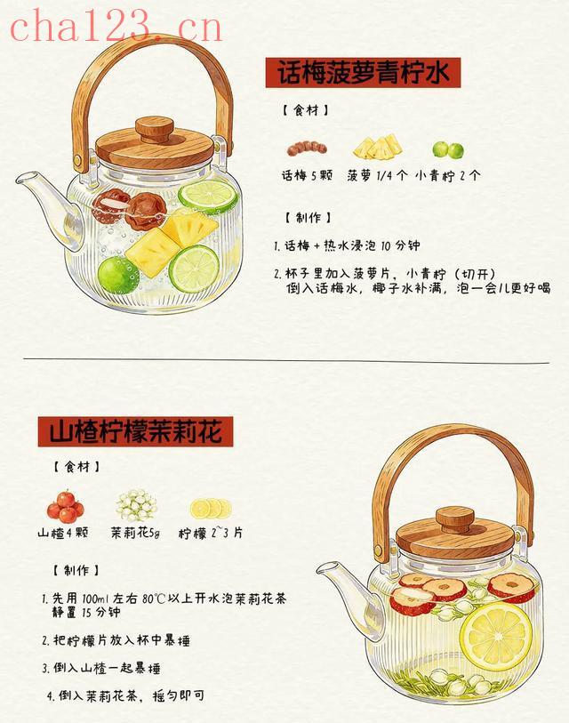 - 山楂柠檬茉莉花:茉莉茶一包热泡三分钟,放温;山楂十克热水冲泡十分钟,柠檬两片,合并在一起。