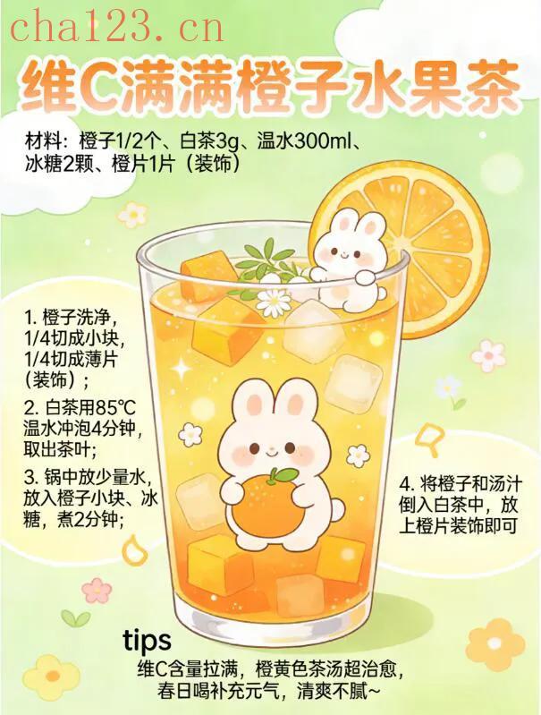 半个橙子切块煮软,3g白茶提前泡好。把煮软的橙子、白茶混合,放少许冰糖调味,用橙片装饰杯口。橙子的香甜彻底融入茶汤,白茶清鲜柔和,暖乎乎入口,橙香四溢,把春日的温柔与甜蜜,全都喝进嘴里。