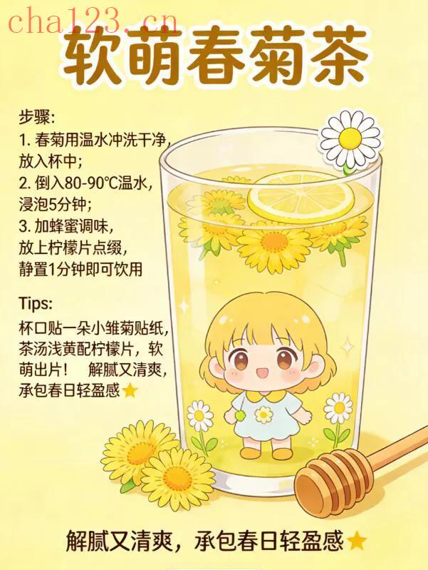 准备干春菊5-6朵、300ml温水,蜂蜜和柠檬片按需添加。春菊用清水冲净,倒入80-90℃的温水,静置5分钟,花瓣慢慢舒展,清香立刻飘满屋子。最后加蜂蜜调味,柠檬片点缀,入口清润回甘,淡淡的菊香抚平浮躁,看书、发呆时喝,温柔又舒心。