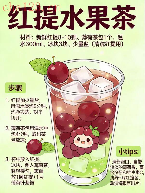 8-10颗新鲜红提洗净切块,薄荷茶包泡出凉茶汤。杯中放满冰块,倒入红提和薄荷茶,轻轻搅匀即可。红提的清甜混着薄荷的清凉,入口清爽回甘,瞬间赶走午后困倦,果香清新,喝完整个人都神清气爽。