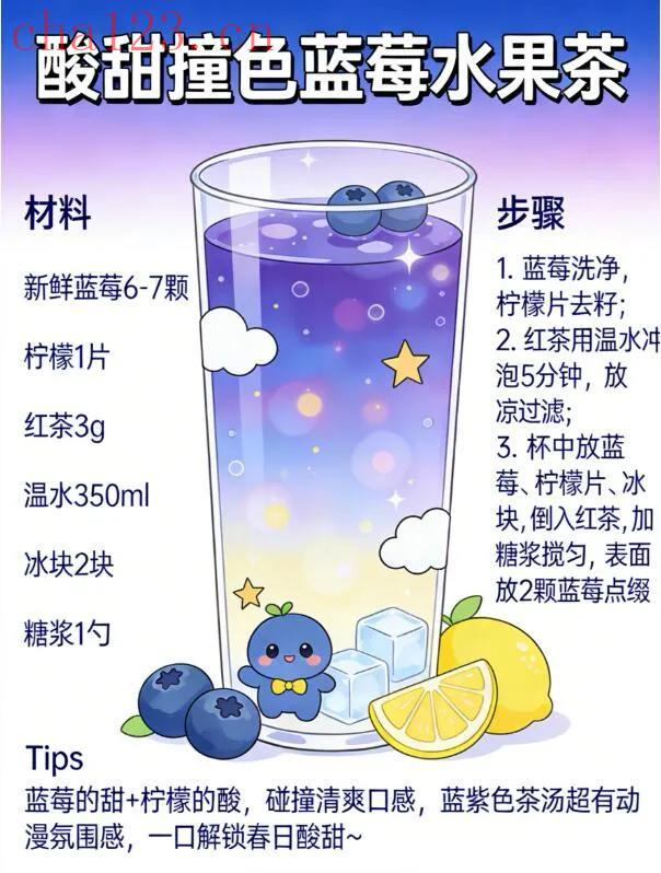 6-7颗新鲜蓝莓洗净,3g红茶泡凉,准备1片柠檬。杯中加冰块,倒入红茶,放进蓝莓和柠檬片,搅匀后加少许糖浆调味。蓝莓的浓郁果香搭配红茶的醇厚,酸甜交织,口感层次超丰富,追剧、办公时来一杯,惬意又满足。