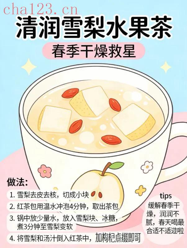 取半个雪梨,洗净去皮切小块,放入小锅煮软,红茶包提前泡好。把煮软的雪梨、泡好的红茶混合,加几颗枸杞装饰,放少许冰糖调味。暖乎乎的茶汤入口,雪梨软糯香甜,红茶醇厚温润,润喉解乏,春日干燥喝它再合适不过。