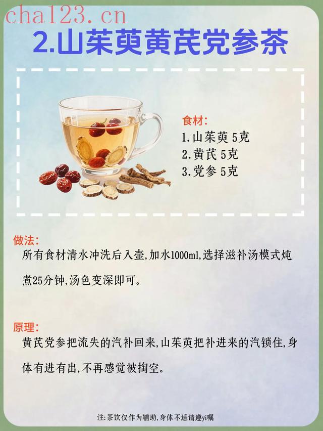 2. 山茱萸黄芪党参茶食材:山茱萸5克、黄芪5克、党参5克