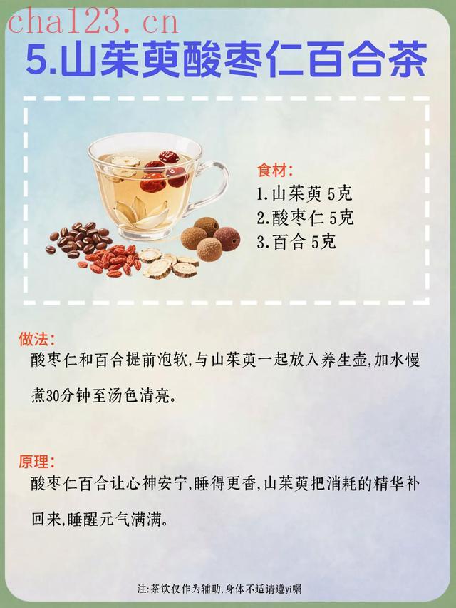 5. 山茱萸酸枣仁百合茶食材:山茱萸5克、酸枣仁5克、百合5克